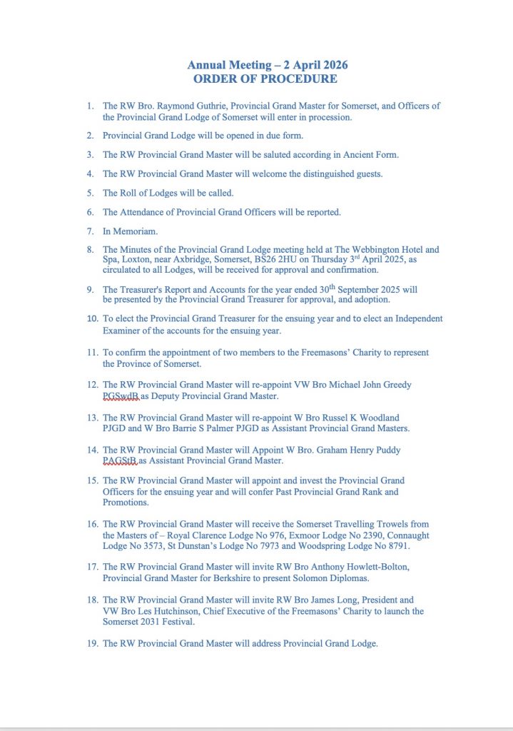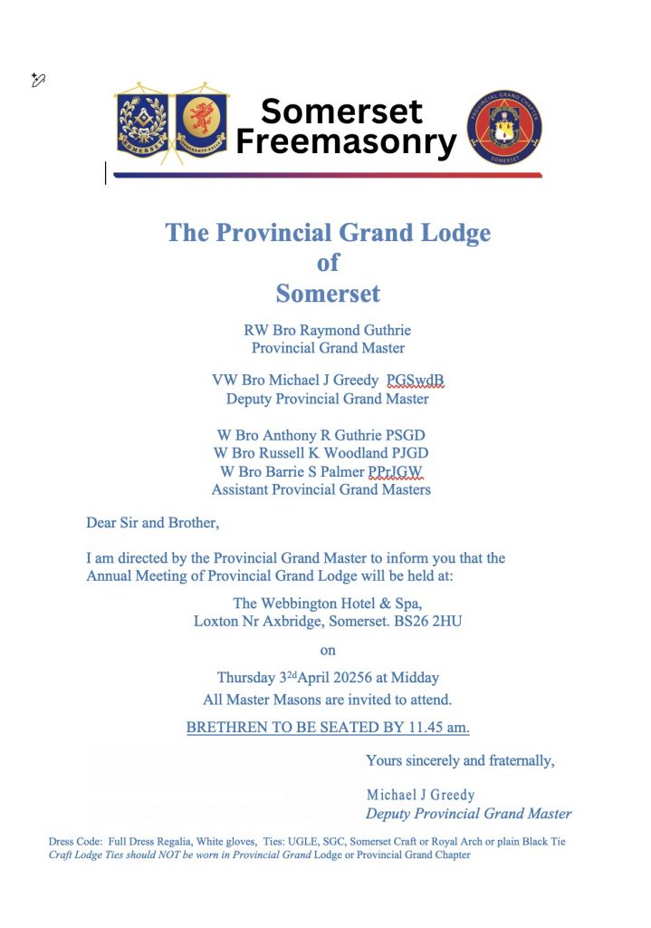 The Annual General Meeting will take place on Thursday 6th April at the Webbington Hotel, Loxton BS26 2HU. Tea and Coffee will be served from 8.30 and Brethren are asked to be seated no later than 10.45.