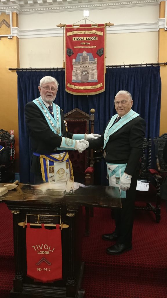At their recent meeting on Saturday 16th September, Mike Dew the current Master of Tivoli Lodge installed his successor, Sandy Glen as the new incumbent of the Chair of KS. It was a busy meeting with four joining members and most importantly John Hodnett received his 50 year award from Martin Slocombe.
