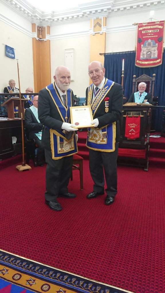 Tivoli Lodge Install New Master and present 50 year Certificate to John Hoddnett