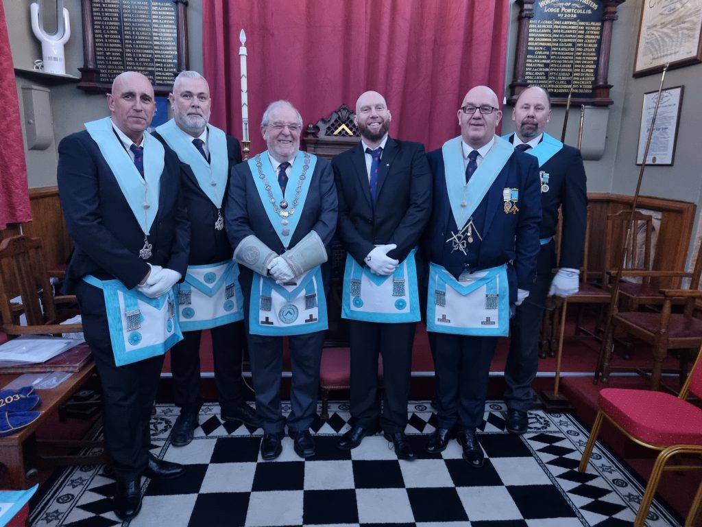 Portcullis first duty of the New Year was to raise John Penfold to the sublime degree of a Master Mason. The Master John Nicholas in his last full ceremony of the year was in fine form. John has been brilliant ritualist and has hardly made an error in his Masonic year. Often going above and beyond the usual Master’s ritual by performing the Signs and Secrets and in all 3 degrees, when needed. The candidate answered his questions perfectly and conducted himself immaculately under the watchful guide of the SD Grant Peckham. Due to illness and injury the Master had plenty of stand in officers to thank including the Tyler Tony Hooper, Inner Guard Andy Altendorf and Junior Deacon Steve McNaughton.