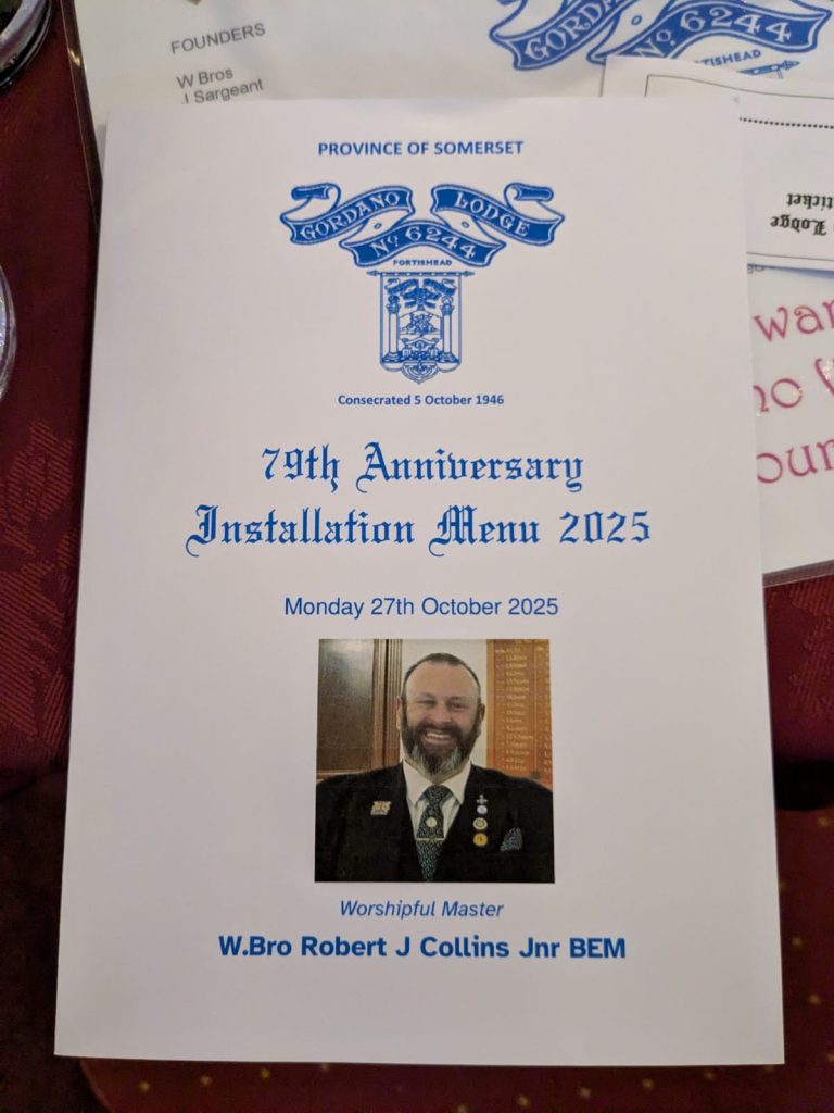 Brethren travelling from near and far gathered to share an evening of friendship and fraternal celebration with their brother and friend — our new Worshipful Master W.Bro Rob Collins Jnr— and to experience once again Gordano Lodge’s renowned hospitality. Both the lodge room and festive board were filled to overflowing, with extra rows of seats brought in to accommodate everyone.