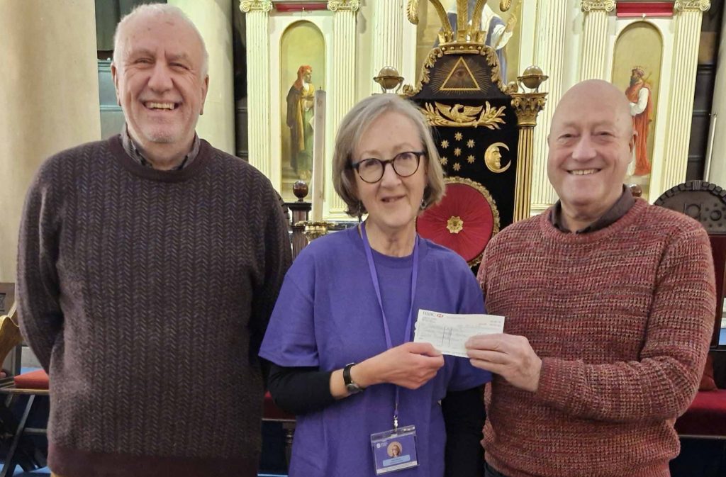 As is customary, the Lodge offered to donate the Alms collection to a charity of the speaker’s choice. Gary nominated Survivors of Bereavement by Suicide (SOBS UK) but also asked if the donation could be made to the branch in the Province of Somerset. That request was fulfilled at Bath Masonic Hall when the current Master of the Lodge, Neil Hawes, accompanied by Transactions Editor Malcolm Toogood, presented a cheque for £350 to Anne Cullis from the Bath Branch.