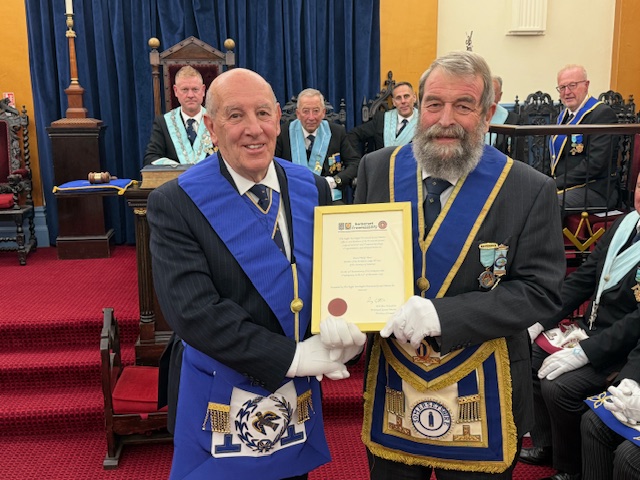 Slocombe (PAPrGM) to their November meeting, to witness Martin having the honour of presenting a 50 year certificate to the also one and only David Hunt! Who joined Birnbeck Lodge exactly 50 years to the day.
