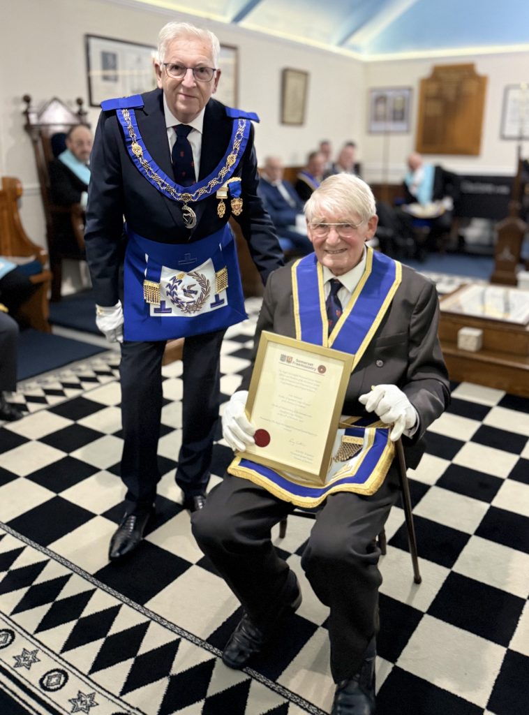 Bruce himself rose to the occasion magnificently, answering his questions superbly and inciting a well‑deserved chorus of applause from the attending brethren. It was a proud moment not only for him, but for all who shared in the ceremony: but the evening didn’t stop there. In a moment that brought a lump to many throats, Assistant Provincial Grand Master Barrie Palmer stepped forward to present a 50‑Year Certificate in Freemasonry to Peter Wellstood. The room fell into a respectful hush as Peter, seated proudly and holding the framed certificate, received warm words and heartfelt recognition for his half‑century of service to the Craft. The image above from the evening says it all — the regalia, the smiles, the chequered floor beneath their feet and the quiet pride in their eyes. It was a snapshot of what Freemasonry is all about: honouring the past, celebrating the present, and inspiring the future.