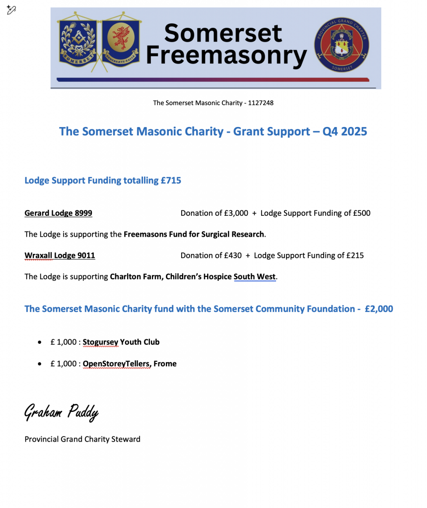 Home/Charity/Somerset Masonic Charity Grant Support Q4 Charity Somerset Masonic Charity Grant Support Q4 15th December 2025 123 15th December 2025 123 Show More Facebook X Share via Email Print