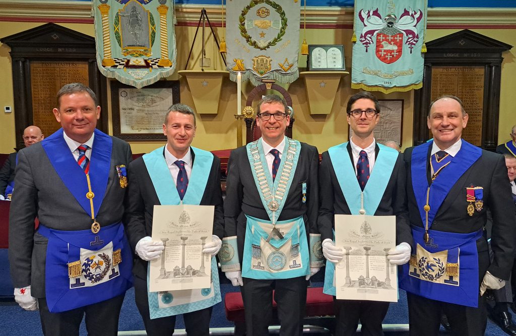 Finally, all present also got to celebrate a couple of younger Brothers, Richard White & Andrew Smith, who were presented with their Grand Lodge certificates by Richard Winter, having completed their third degrees earlier in the year. Graham Puddy also gave them some information about Royal Arch Masonry, giving them both something to think about undertaking in the near future.