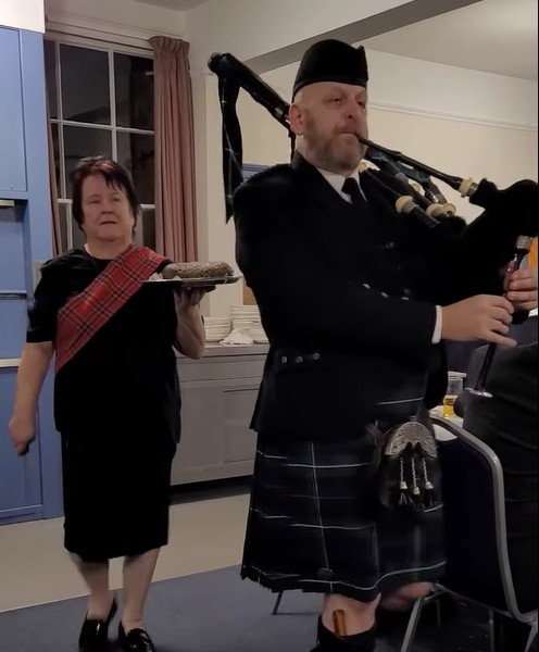 Ed is well known locally as he runs his catering business alongside his wife Jackie from Vivary Park Golf Club; he is a retired British Army Officer and also a leading light in the Taunton Armed Forces Day annual event, as part of the National Armed Forces week programme. After the ceremony those present moved to the dining room to enjoy a Burns Night festive board, as always provided in great style by Karen and her team. Diners saw the Haggis piped in (above top) and the traditional address to the Haggis being delivered by Chris Marchmont (below) with his normal Scottish grace and style.