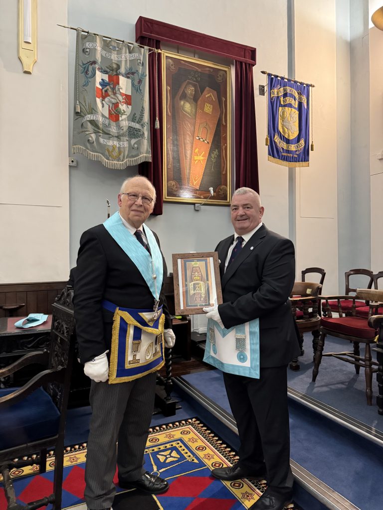 On the 22nd January, Emergency Services Lodge (ESL) saw Brother Ed Cullen raised to the sublime degree of a Master Mason in front of a packed temple at Taunton Masonic Hall. In a ceremony witnessed by around 90 brethren, Ed left the Fellowcraft degree and took a third step his Masonic career. Ed received a presentation around the Third Degree tracing board from Malcolm Redston ESL’s Director of Ceremonies (below) with some extra Solomon Masonic learning nuggets.