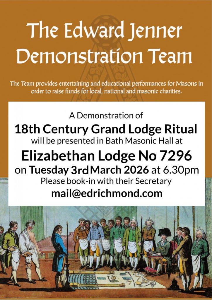 On Tuesday 3rd March 2026, Elizabethan Lodge are hosting the Edward Jenner Demonstration Team at Bath Masonic Hall for a special 18th century Masonic demonstration, presented in full period style.