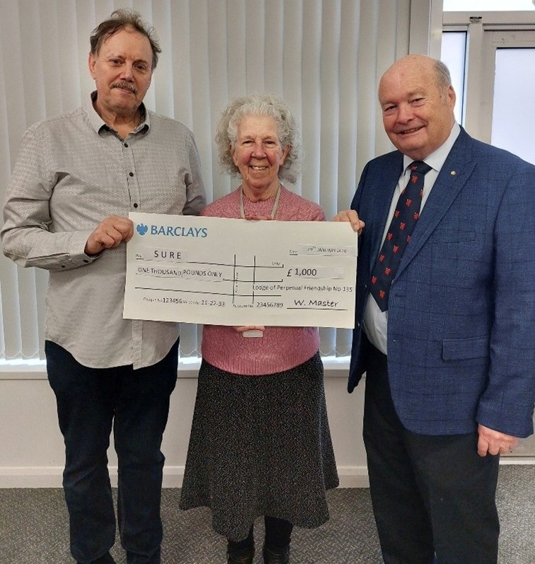 The Lodge of Perpetual Friendship, Bridgwater recently donated £1000 to the Somerset Unit for Radiotherapy Equipment (SURE). This local independent charity provides top class cancer diagnosis and treatment at the Beacon Centre, located within Musgrove Hospital, Taunton.