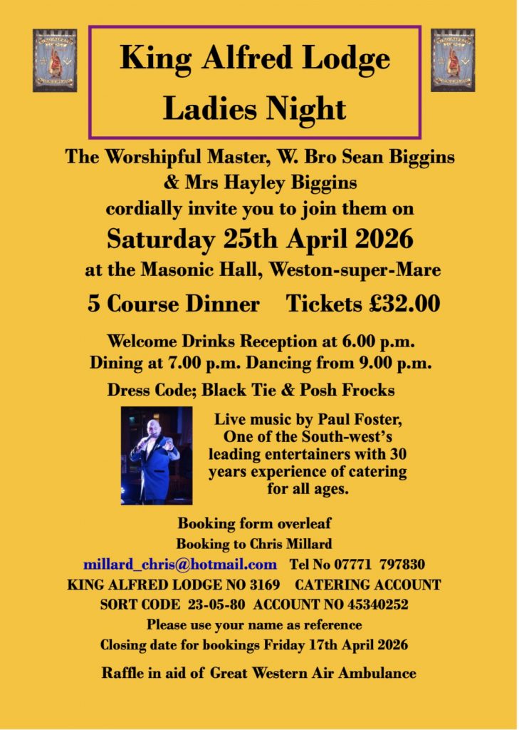 Sean Biggins the WM of King Alfred Lodge, cordially invite you to his Ladies night at the Masonic Hall Weston s Mare.