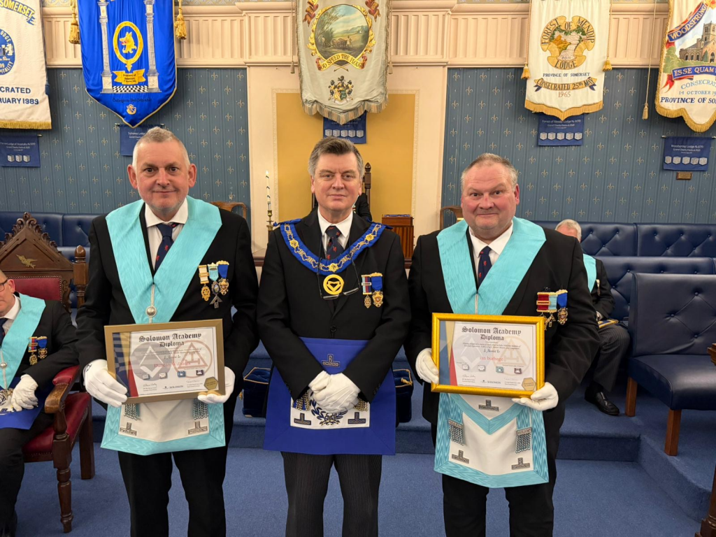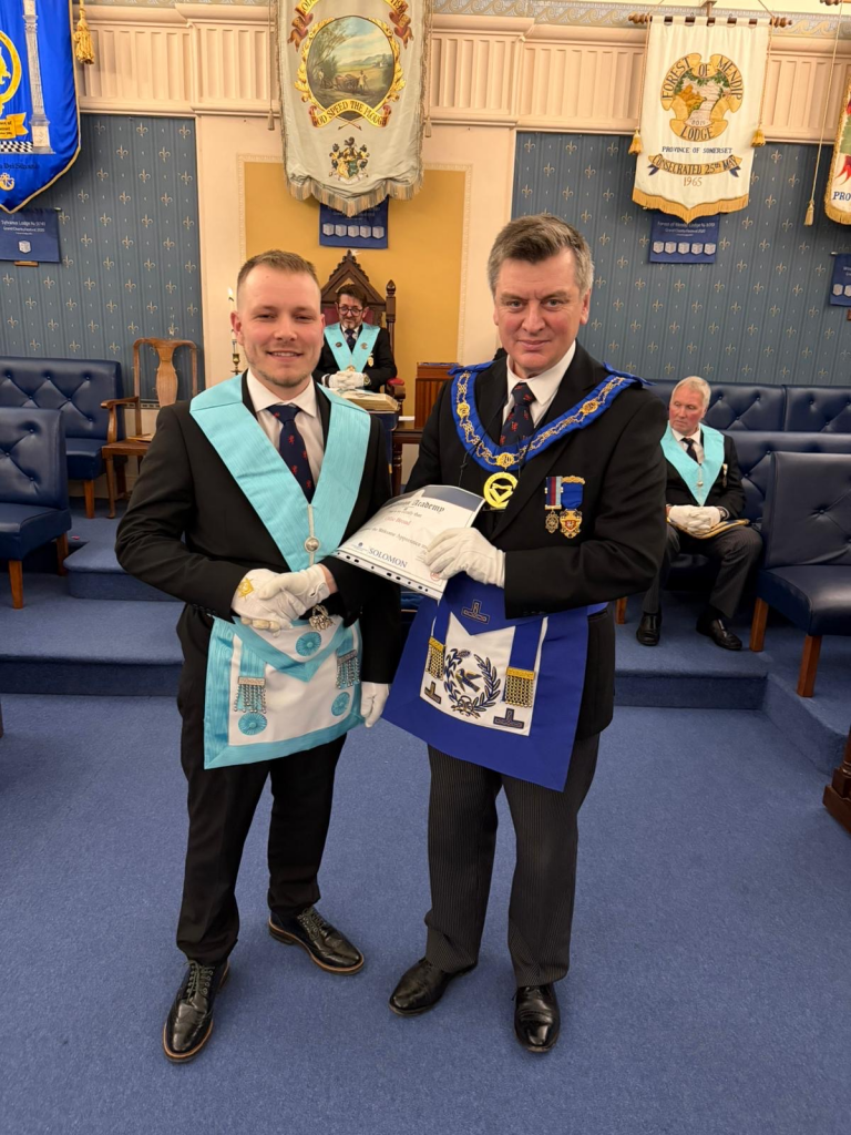 Forest of Mendip held a white table evening for friends , family and potential candidates , the evening commenced with receiving the APGM WB Russ Woodland and the Provincial Mentor Ray Conneely who presented Solomon diplomas to WB Bubbs and WB Duncan , also receiving Solomon certificates B Ollie Broad who completed the EP , FC and MM modules.