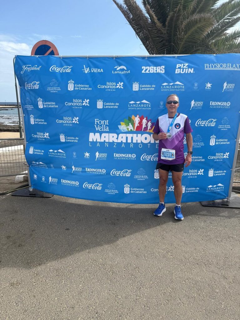 Damien is already a runner and he has been training every day to get himself very fit.The photo shows him after completing a marathon in Lanzarote in December.