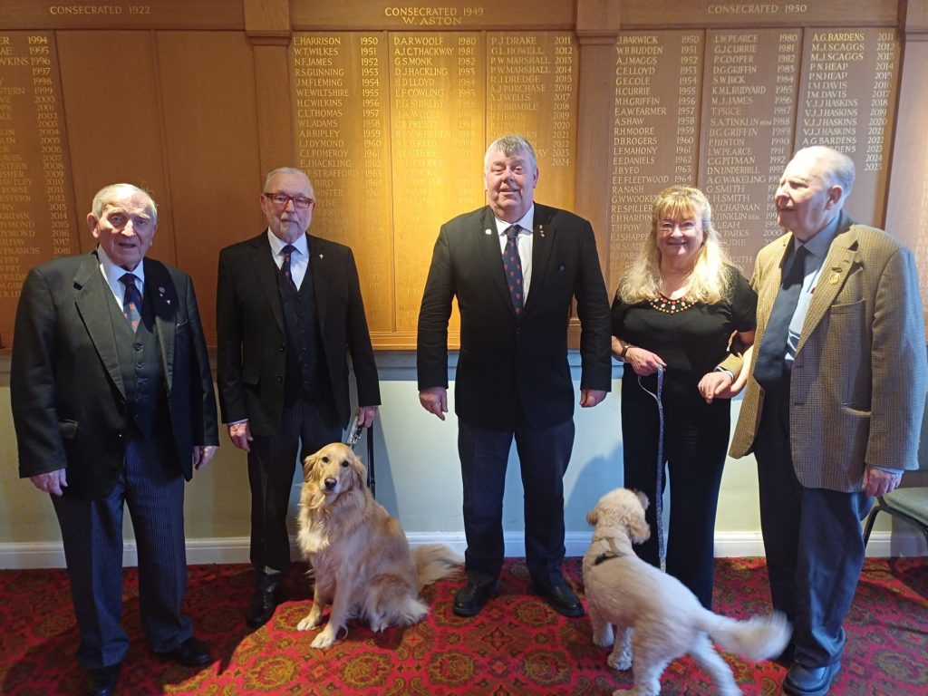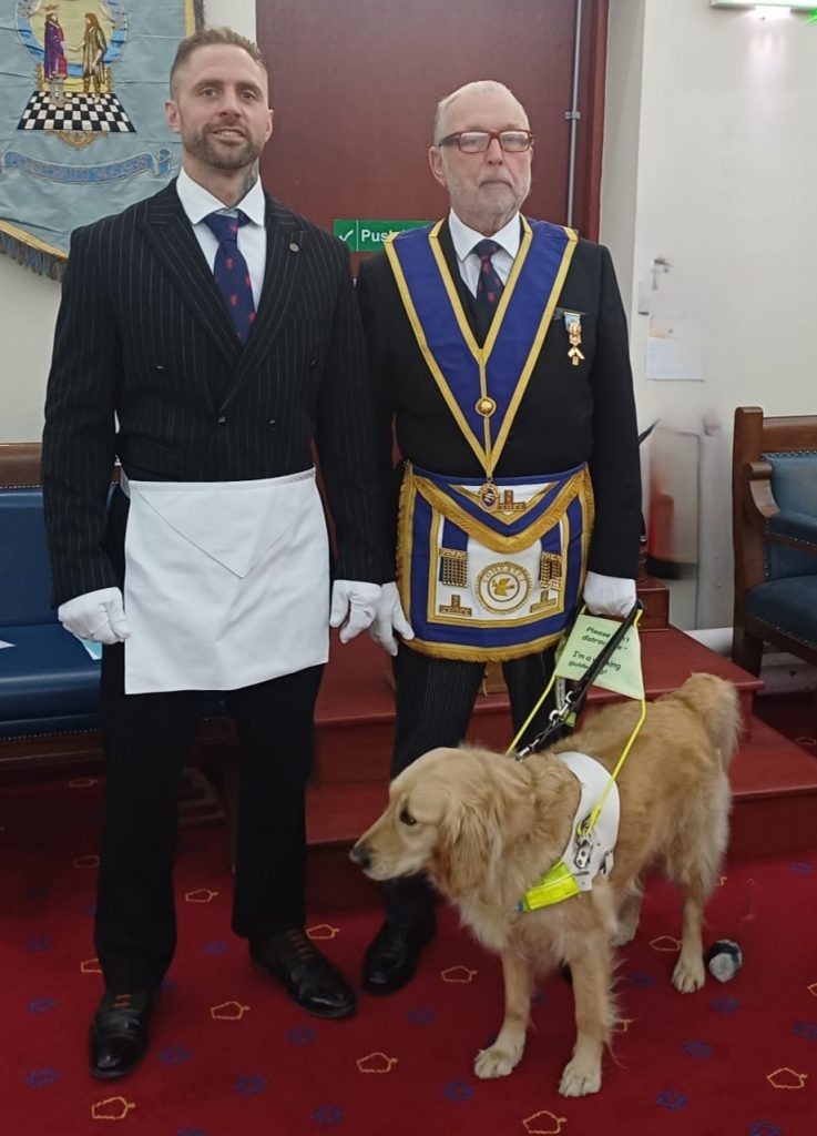 They were further honoured by the presence of Tony Ward, accompanied by his much loved and impeccably behaved Guide Dog Poppy. Poppy quickly became the star of the afternoon, winning the affection of brethren and ladies at the festive board. There was even light-hearted discussion about measuring her up for a Master’s Apron!