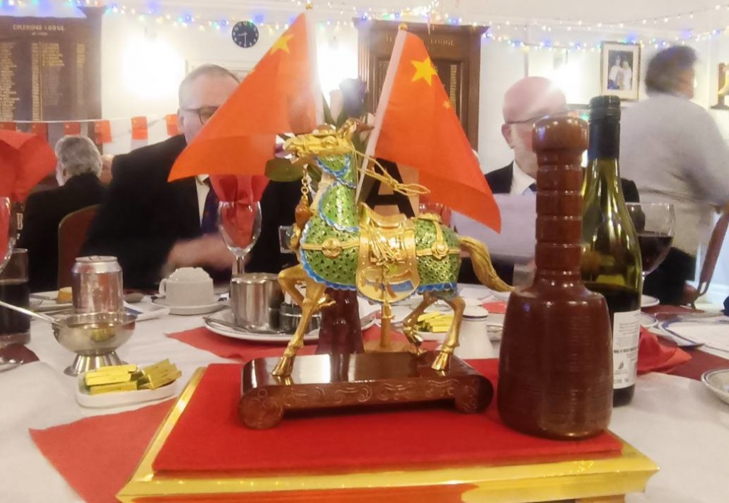 Downstairs, the Festive Board proved equally memorable. The dining room had been beautifully decorated with traditional Chinese ornaments, many of which had been brought back from China by W.Bro John Wyatt of Estune Lodge. The occasion marked the Chinese New Year, the Year of the Fire Horse. Brethren enjoyed a first-class Chinese meal prepared by Zena (and were reassured that horse was definitely not on the menu!). A toast explored the links between Freemasonry and ancient Chinese traditions, after which the newly-initiated Brother was welcomed with the Entered Apprentice Song and an explanation of the Chain.
