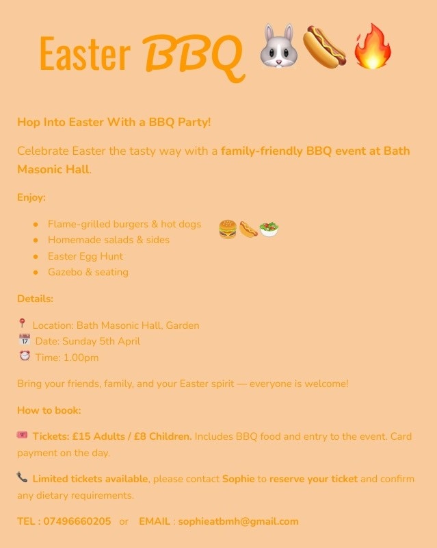 Home/Events/Easter BBQ at Bath Masonic Hall CentresEvents Easter BBQ at Bath Masonic Hall 5 hours ago 17 5 hours ago 17 Show More Facebook X Share via Email Print