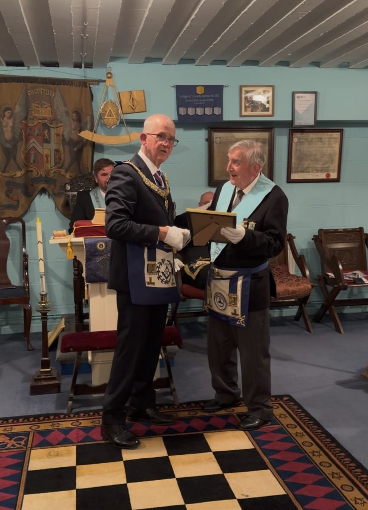 RW Bro Raymond Guthrie, The Provincial Grand Master (PGM), stated that it was both a privilege and a pleasure to present a framed certificate commemorating 50 years in Freemasonry to W.Bro Michael Adams, a Brother whose life has been deeply intertwined with the Craft.