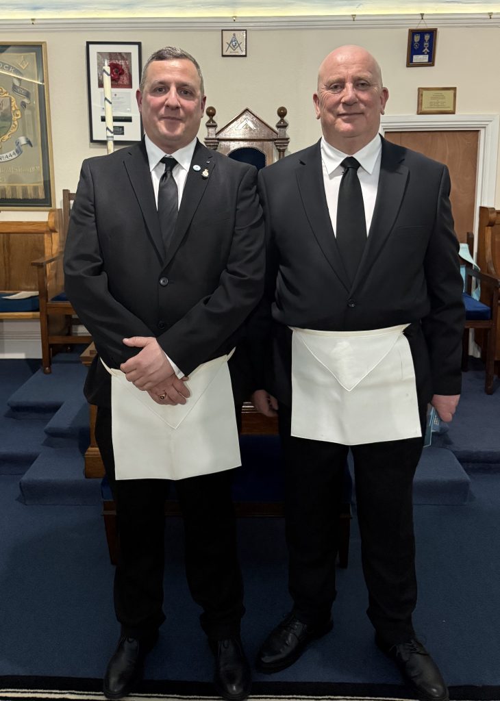 Sitting proudly in the North East corner was Brother David Shearer, Darryl’s proposer and lifelong friend (pictured above left in both photos). Initiated himself only a few months earlier in November 2025, David watched with unmistakable pride as the man he has known for so many years took his first steps into Freemasonry. The bond between proposer and candidate is always special, but on this night it carried an extra warmth—two friends now united in a shared journey of learning, service, and brotherhood.