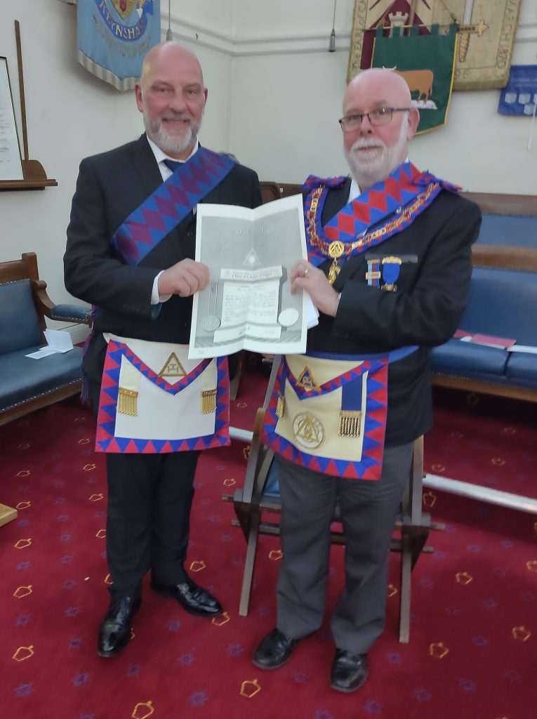 But the evening still had more as the Principals for the next year were elected – Steve Coles as 1st Principal, Barry McCormack as 2nd Principal and Kevin O’Neil as 3rd Principal – and then Comp. Simon Hall was presented with his Supreme Grand Chapter Certificate by Andy Wade.
