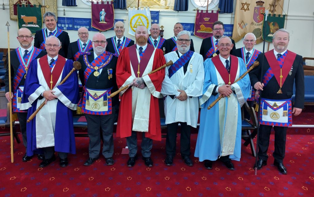 The pictures show Comp Simon Hall receiving his SGC Certificate from E. Comp Andy Wade Pr3GPrin and the Three Principals of the Chapter, Angus Ross, Steve Coles and Barry McCormack, lined up with Andy Wade, Pr3GPrin and the Exaltee, Comp Dave Bowen escorted by the Chapter DC Mark Saunders and PrAGDC Matt Williams and the visiting members of the Provincial Team behind.